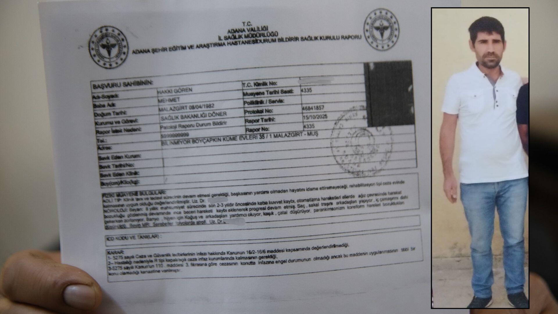 İnsan Hakları Derneği’nin (İHD) Merkezi Hapishaneler Komisyonu’nun 7 Nisan 2025’teki hasta tutsak raporuna göre, cezaevlerinde en az bin 412 hasta tutsak bulunuyor. Durumu ağır kabul edilen 335 tutsağın 230’u tek başına yaşamını devam ettiremiyor. Ağır hasta tutsaklardan biri de Kürkçüler F Tipi Kapalı Cezaevi’nde tutulan Hakkı Gören. Muş 3’üncü Ağır Ceza Mahkemesi’nce 15 yıl 8 ay hapis cezası verilen Hakkı Gören, 2018’de tutuklandı. 4 yıl Edirne Cezaevi’nde tutulan Gören, 2022’den bu yana Adana Kürkçüler F Tipi Kapalı Cezaevi’nde tutuluyor. Ağır hasta tutsaklar arasında bulunan Gören, hastalıklarına dair rapor düzenlemesi için bu yılın Ekim ayında Adana Şehir Eğitim ve Araştırma Hastanesi’ne sevk edildi. Hastanenin sağlık kurulu, Gören’in duruma için 15 Ekim 2025’de düzenlediği raporda, Sekonder Parkinsonizm teşhisi koydu. Raporda, Gören’in durumunun ciddi olduğu, tek başına yaşamsal ihtiyaçlarını karşılayamadığı, cezaevinde kalmasının tıbben uygun olmadığı, başkasının yardımı olmadan hayatını idame ettiremeyeceği ve kalmasının uygun olmadığı belirtildi. Ancak, raporun devamında, Gören’in rehabilitasyon tipi cezaevine kalmasının uygun olduğu değerlendirmesi yapıldı. Raporda, Gören’in infazının konutta yapılabileceğinin önünde ise bir engel bulunmadığı kaydedildi.