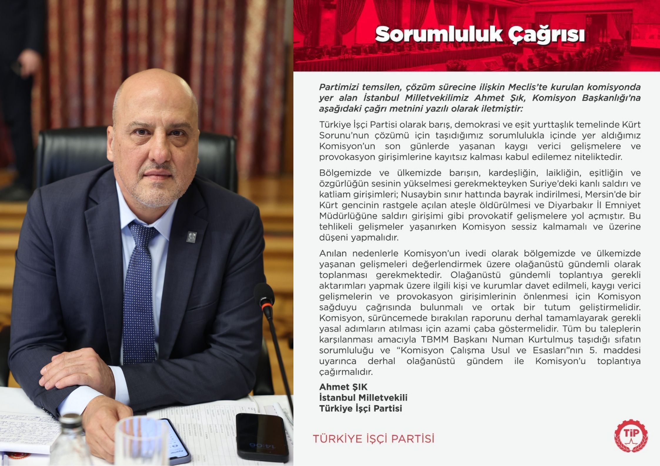 TİP’in sanal medya platformu X hesabından açıklanan çağrıda şu ifadelere yer verildi: “Partimizi temsilen, çözüm sürecine ilişkin Meclis’te kurulan komisyonda yer alan İstanbul Milletvekilimiz Ahmet Şık, Komisyon Başkanlığı’na aşağıdaki çağrı metnini yazılı olarak iletmiştir: “Türkiye İşçi Partisi olarak barış, demokrasi ve eşit yurttaşlık temelinde Kürt Sorunu’nun çözümü için taşıdığımız sorumlulukla içinde yer aldığımız Komisyon’un son günlerde yaşanan kaygı verici gelişmelere ve provokasyon girişimlerine kayıtsız kalması kabul edilemez niteliktedir. Anılan nedenlerle Komisyon’un ivedi olarak bölgemizde ve ülkemizde yaşanan gelişmeleri değerlendirmek üzere olağanüstü gündemli olarak toplanması gerekmektedir. Tüm bu taleplerin karşılanması amacıyla Meclis Başkanı Numan Kurtulmuş taşıdığı sıfatın sorumluluğu ve ‘Komisyon Çalışma Usul ve Esasları’nın 5’inci maddesi uyarınca derhal olağanüstü gündem ile Komisyon’u toplantıya çağırmalıdır.”