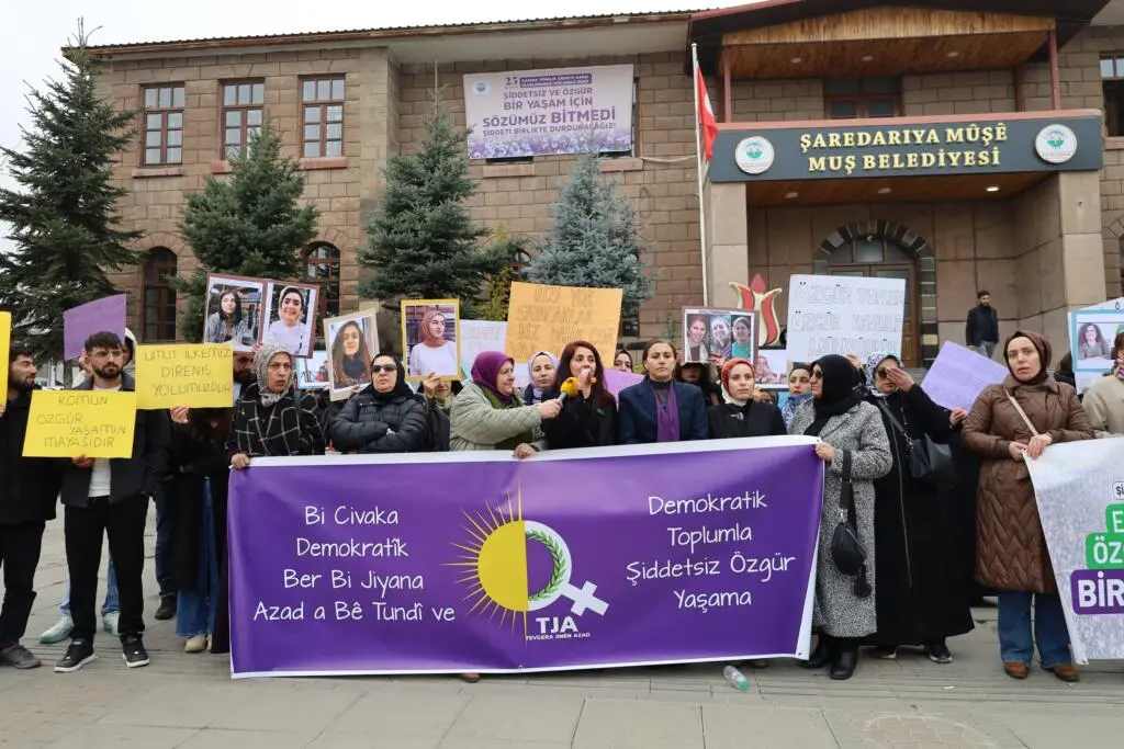 Mûş’ta TJA öncülüğünde, 25 Kasım dolayısıyla basın açıklaması gerçekleştirildi. Mûş Belediye binası önünde bir araya gelen kadınlar, Türkçe ve Kürtçe “Bi civaka demokratîk ber bi jiyana azad a bê tundî ve” yazılı pankart açtı. Kadınlar ellerinde erkek devlet şiddeti tarafından katledilen ve sembolleşen kadınların fotoğrafları ve “Sözümüz bitmedi şiddeti birlikte durduracağız”, “Rojin Kabaiş için adalet”, “Komün özgür yaşamın mayasıdır” yazılı dövizler taşıdı.