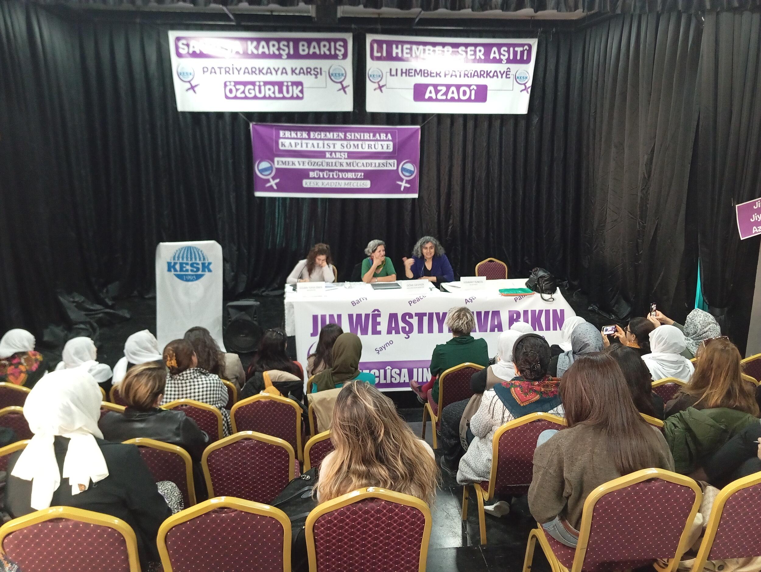 Kamu Emekçileri Sendikalar Konfederasyonu (KESK) Mêrdîn Kadın Meclisi tarafından “Kadın ve Barış” konulu panel düzenlendi. Mêrdîn’de bulunan özel bir salonda düzenlenen panele çok sayıda kadın katıldı. Gülbin Tüfek Öner moderatörlüğünde gerçekleştirilen panele Barışa İhtiyacım Var Kadın İnisiyatifi’nden Yasemin Özgün, KESK MYK Kadın Sekreteri Döne Gevher ile TJA’lı Sabahat Tuncel panelist olarak katıldı. Özgürlük ve demokrasi mücadelesinde yaşamını yitirenler anısına saygı duruşu sonrasında açılış konuşmalarının yapıldığı panelde, panelistler sırasıyla söz aldı.