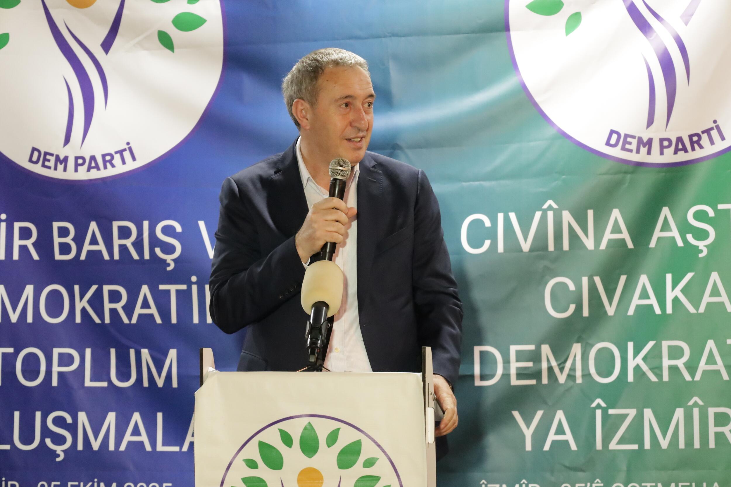 DEM Parti Eşgenel Başkanı Tuncer Bakırhan, İzmir Gaziemir’de iş insanları, STK temsilcileri ve yurttaşlarla buluştu. Bakırhan, ‘Gençlerin geleceği çalınmasın, asgari ücretliler geçim derdine düşmesin diye barış istiyoruz’ dedi