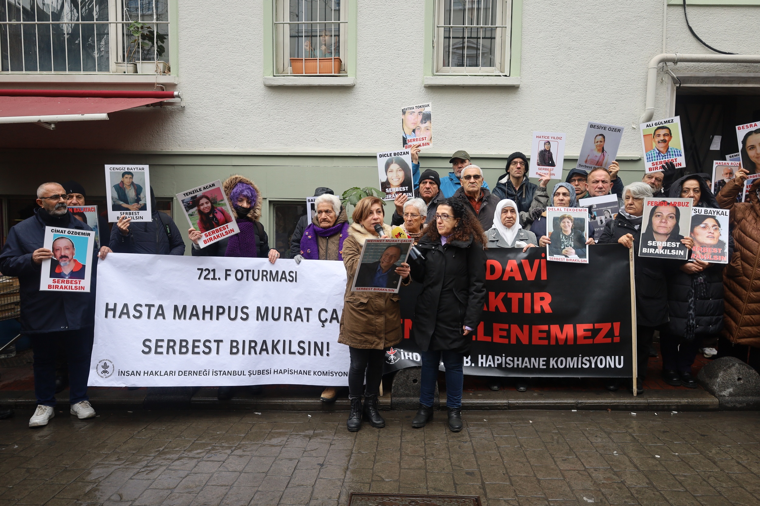 İnsan Hakları Derneği (İHD) İstanbul Şubesi Hapishane Komisyonu, her hafta düzenledikleri “F oturması” eyleminin 721’incisini Beyoğlu’nda bulunan dernek binası önünde gerçekleştirdi. Bu haftaki eylemde, İzmir 2 Nolu F Tipi Cezaevinde tutulan ağır hasta tutsak Mehmet Murat Çalık’ın sağlık durumuna dikkat çekildi. Açıklamaya çok sayıda hak savunucusu destek verdi. Basın metninin İHD Merkez Yürütme Kurulu (MYK)Üyesi Gülseren Yoleri okudu.