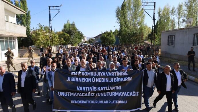 Vartinîs Belediyesi önünde toplanan kitle, Türkçe ve Kürtçe “Em ê komkujîya Vartînîse jibîrnekin û nedin ji bîrkirin” yazılı pankart açtı. Ancak valiliğin yasağı ve pankartta geçen “katliam” sözcüğü gerekçe gösterilerek askerler yürüyüşe pankartla izin vermeyeceklerini belirtti. Tüm engellemelere rağmen kitle pankartla yürüyüşünü sürdürdü.