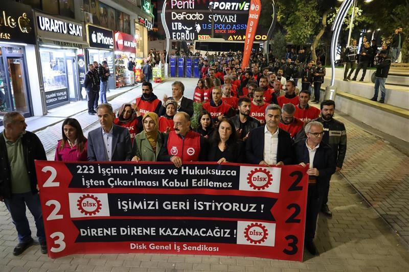 Devrimci İşçi Sendikaları Konfederasyonu (DİSK) ve DİSK Genel-İş Wan Şubesi öncülüğünde 223 işçinin “İşimize geri döneceğiz” şiarıyla başlattığı direniş 104’üncü gününde devam ediyor. Sanat sokağında bir araya gelen işçiler Amed’in Pasûr ilçesinde yaşanan iş cinayeti ve TSK’ya bağlı kargo uçağında yaşamını yitirenler için slogan ve yürüyüş gerçekleştirmedi. Açıklamayı DİSK Genel-İş Wan Şubesi Başkanı Ömer Tekin okudu.