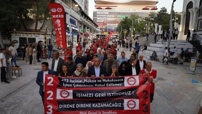 Sanat Sokağı girişinde bir araya gelen kitle, halaylarla nöbete başladı. İşçilerin direnişine destek amacıyla, yerine kayyım atanan Wan Belediye Eşbaşkanları Neslihan Şedal ve Abdullah Zeydan da yürüyüş ve basın açıklamasına katıldı. İşçiler, “223 işçinin haksız ve hukuksuzca işten çıkarılması kabul edilemez. İşimizi geri istiyoruz, direne direne kazanacağız” yazılı pankartlarla sloganlar eşliğinde açıklamanın yapılacağı Gençlik Sokağı’na yürüdü. Yürüyüş boyunca çevredeki yurttaşlar alkışlar ve korna sesleriyle desteğini gösterdi.
