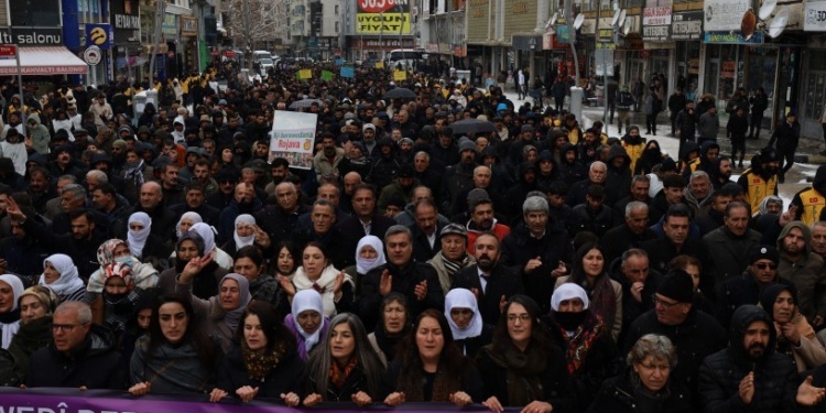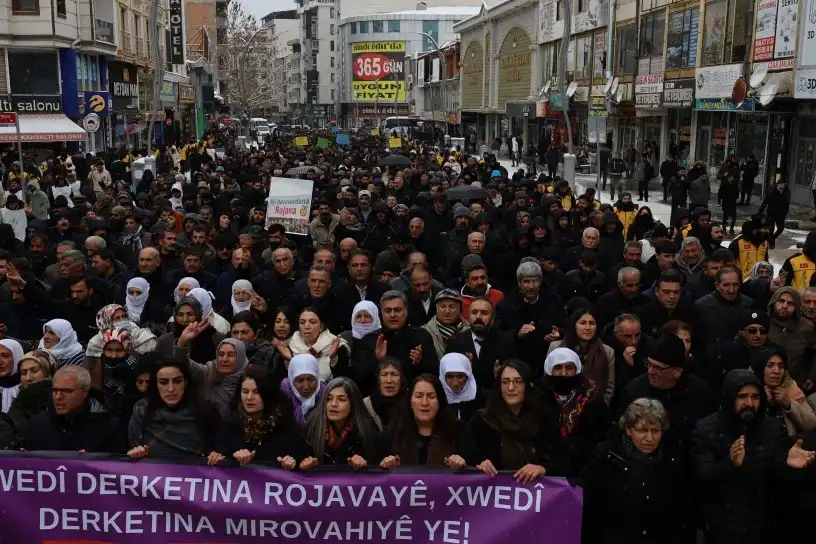 Yürüyüşte sıklıkla, “Bijî berxwedana Rojava”, “Kürdistan faşizme mezar olacak”, “Bijî berxwedana QSD’ê” sloganları atıldı. Birçok yurttaş da bulunduğu yerlerden pencerelere çıkarak eyleme destek verdi. Yaklaşık 3 kilometrelik yolu kar yağışı altında yürüyen binler Beşyol Meydanı’na ulaştı. Yürüyüş sonrası Demokratik Birlik İnisiyatifi Eşsözcüsü ve DEM Parti Wan Milletvekili Gülcan Kaçmaz Sayyiğit konuştu.