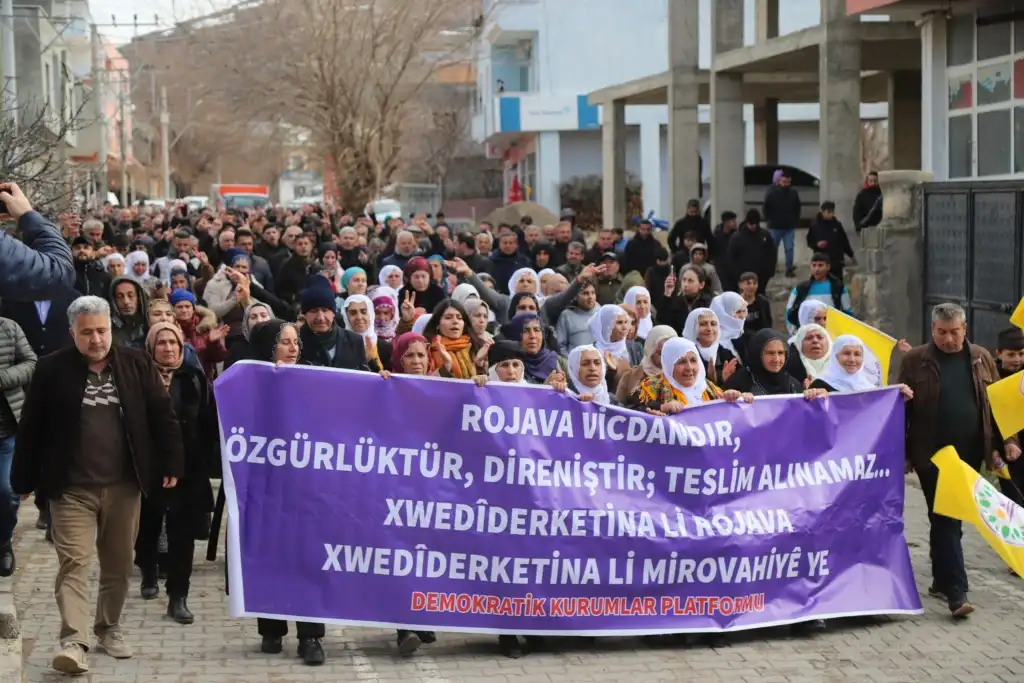 Wan’da Demokratik Kurumlar Platformu öncülüğünde HTŞ destekli grupların Halep’e ve Kuzey ve Doğu Suriye’ye yönelik saldırıları yaptığı yürüyüş ile protesto etti. Kurtuluş Parkı’nda toplanan binler, “Xwedî derketina Rojava xwedî derketina mirovahiyê ye, Rojava xeta me ya sore, em rê nadin dagirkerî” pankartıyla yürüdü. Yürüyüşte gençler, “Li ser şopa Denizan îmana me berxwedan” pankartını açarken, kitle “direniş alanlarında çetelere geçit yok” dövizleri kaldırdı.