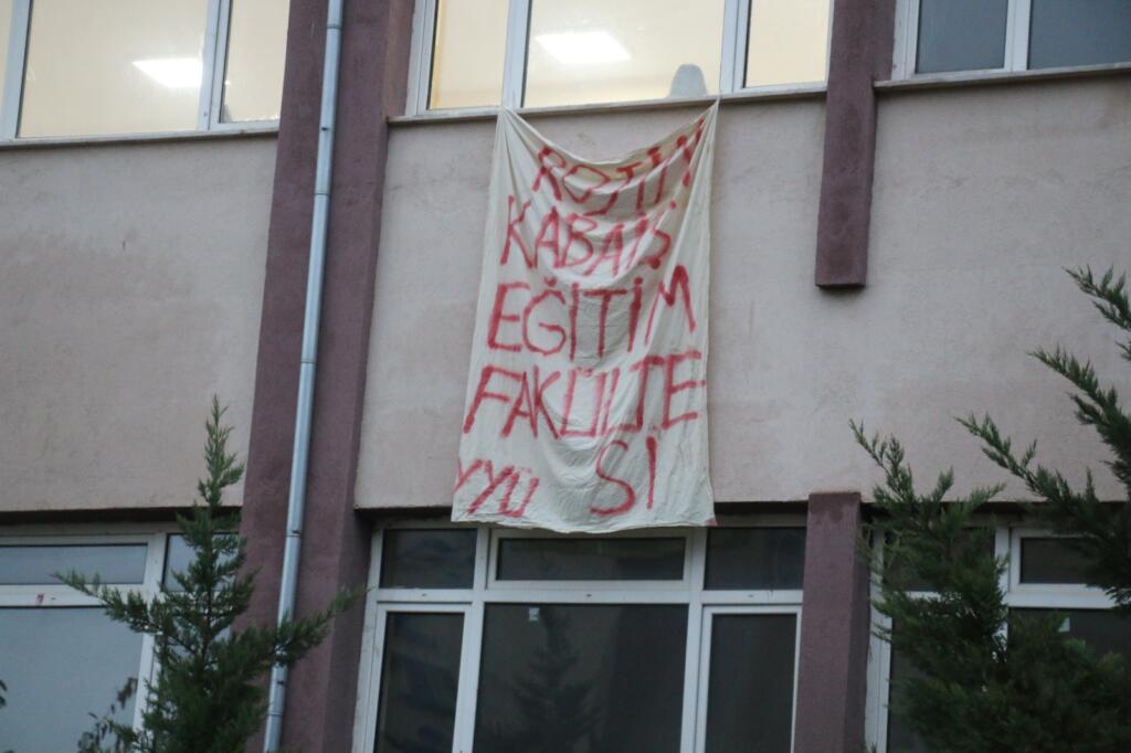 Adli Tıp Kurumu’nun (ATK) 11 Ekim’de açıkladığı rapor sonrası, 9 gündür kampüs içinde eylemlerini sürdüren Öğrenciler, Rojin Kabaiş’in okuduğu fakülteye yürüyerek binaya “Rojin Kabaiş Eğitim Fakültesi” pankartı astı.