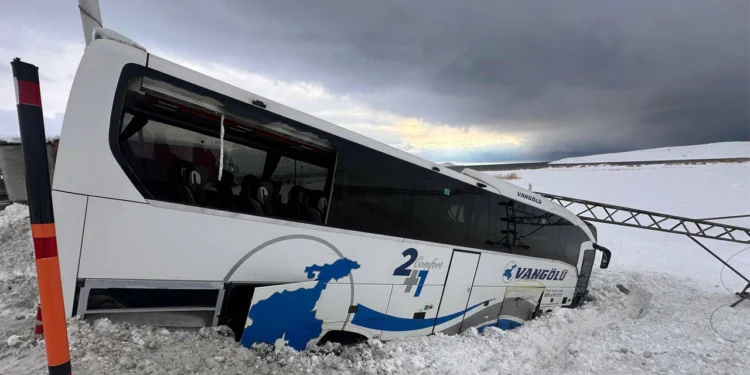 Wan-Erdîş kara yolunda Van Gölü firmasına yolcu otobüsü, Karahan Mahallesi yakınlarında kar küreme çalışması yapan araca çarptıktan sonra yoldan çıktı.