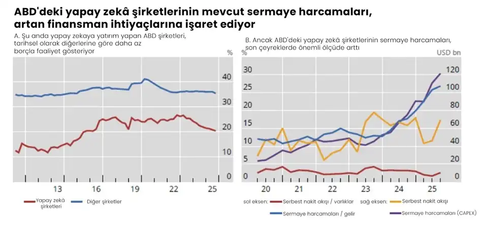 BIS’e göre de ‘Bilgi Teknolojisi’ (BT) sektörünün önde gelen şirketleri, tarihsel olarak yatırımlarının çoğunu işletme nakit akışlarından (iç kaynaklarla) finanse ettiler. Ancak, mevcut ve öngörülen yapay zekâ ile ilgili yatırım ihtiyaçlarının ölçeği o kadar büyük ki şirketler dış finansman kaynakları arayışı içine girdiler. Bu yüzden de bu tür yatırımları borçlanma yoluyla finanse etme eğilimi giderek artıyor. Bu değişim kuşkusuz, finansal istikrar konusunda da önemli sorular ortaya atıyor. (2)