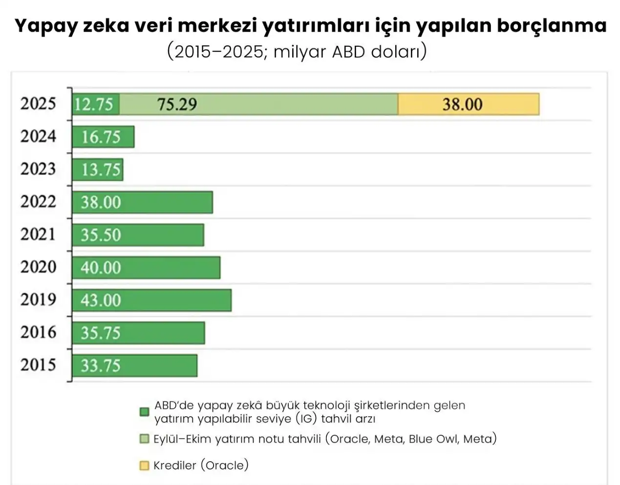 Aşağıdaki tablo 2015 yılından bu yana, “yapay zekâ veri merkezi inşaatı” için yapılan yıllık borçlanma tutarlarını gösteriyor.
