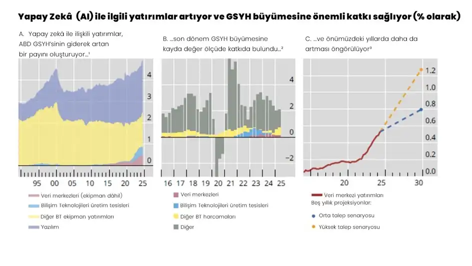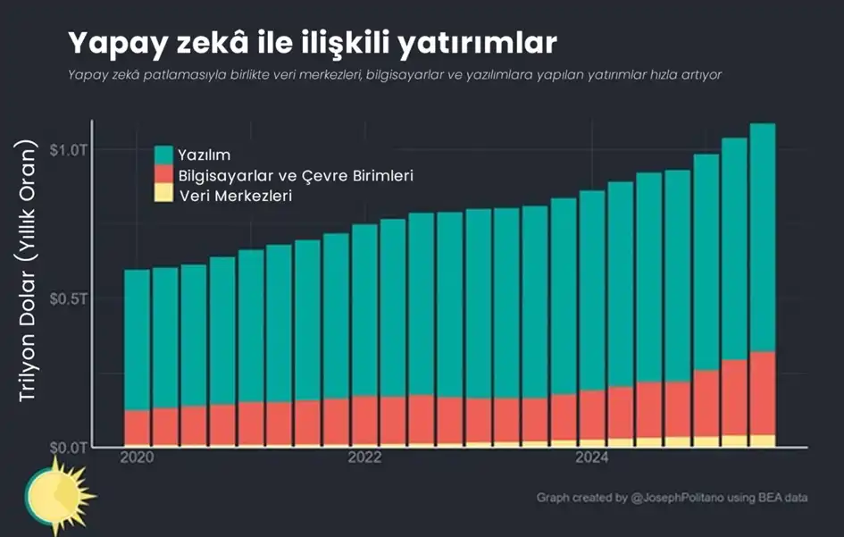 Bu bilgisayarlar ve ilgili çevre birimlerine yapılan gerçek sabit yatırımlar, yıllık bazda 270 milyar doların üzerine çıkarak rekor seviyeye ulaştı. Bu rakam, geçen yıla göre yaklaşık yüzde 50, ChatGPT’nin piyasaya sürülmesinden bu yana ise yüzde 77 artış gösterdi. Özetle, yapay zekâ bağlantılı veri merkezi, bilgisayar ve yazılım yatırımlarına yapılan harcamaların toplamı şu anda yıllık 1 trilyon doları aşıyor ve rekor biçimde ABD ulusal hasılasının yaklaşık yüzde 3,5’ine denk düşüyor. (1)