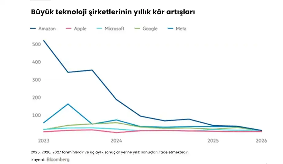 Yapay zekadan elde edilen kârlar söz konusu olduğunda, durum daha net olarak anlaşılıyor. Büyük teknoloji şirketlerinin yıllık kâr artışları son birkaç çeyrektir sabit veya yavaşlamış durumda ve bunun 2025 ve 2026’da daha da yavaşlaması bekleniyor. (5) Sermayenin kârlılığı azaldığında ise yeni teknolojilere yatırım yapma motivasyonu azalıyor.
