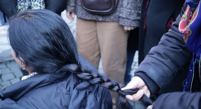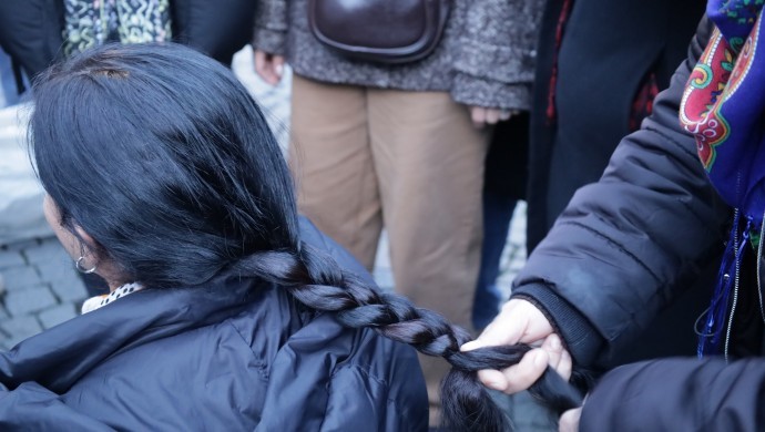 İzmir’de kadınlar, Rojava’ya saldıran HTŞ ve DAİŞ ve Türkiye’nin desteklediği paramiliter grupların bir mensubunun katledilen YPJ’li bir kadın saç örgüsünü kesip video yayınlamasına tepkilerini saçlarını örerek gösterdi